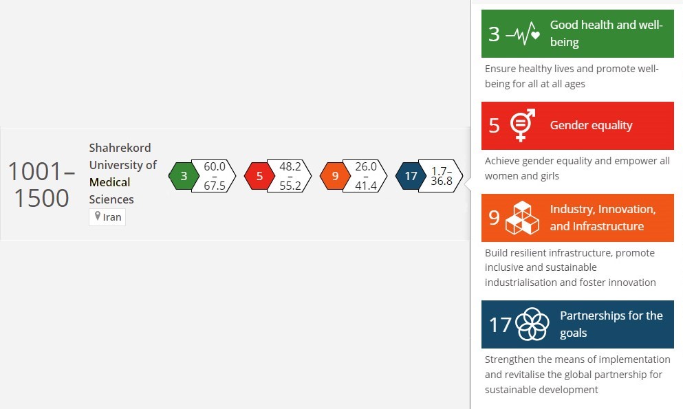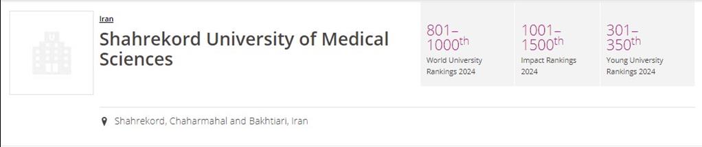 In line with the plans made to improve the rank of Shahrekord University of Medical Sciences in the international ranking systems and to collect, translate, and upload information and documents in the relevant time frame in 2023, which was done by the experts of the books and publications office of the Deputy of Research and Technology of Shahrekord University of Medical Sciences, according to the latest ranking report of young universities (Young University Rankings 2024) in the Times international ranking database, Shahrekord University of Medical Sciences was ranked 300-350 among the world's young universities. Also, Shahrekord University of Medical Sciences was ranked 1000-1500 among universities worldwide and ranked 17th among Iranian universities in the first year of applying for University Impact Rankings 2024.